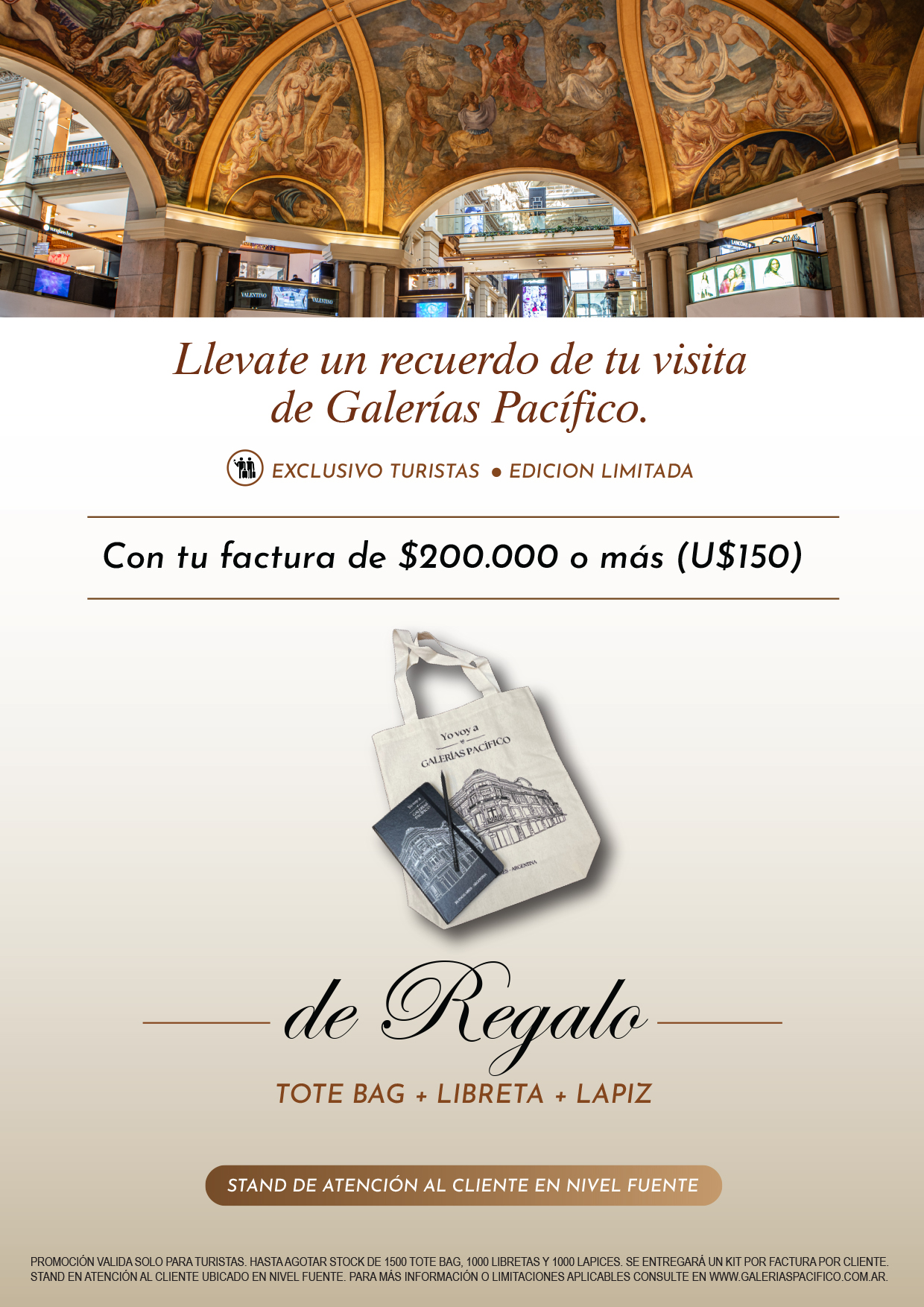 PROMOCIÓN EXCLUSIVA PARA TURISTAS QUE ACREDITEN NACIONALIDAD EXTRANJERA. VALIDA HASTA EL 28/02/2026 O HASTA AGOTAR STOCK DE 1000 TOTE BAG, 1000 LIBRETAS Y 1000 LAPICES NEGROS. SE ENTREGARÁ UN KIT POR FACTURA POR CLIENTE. STAND DE CANJE: ATENCIÓN AL CLIENTE UBICADO EN NIVEL FUENTE. PARA MÁS INFORMACIÓN O LIMITACIONES APLICABLES CONSULTE EN EL STAND DE ATENCION AL CLIENTE.