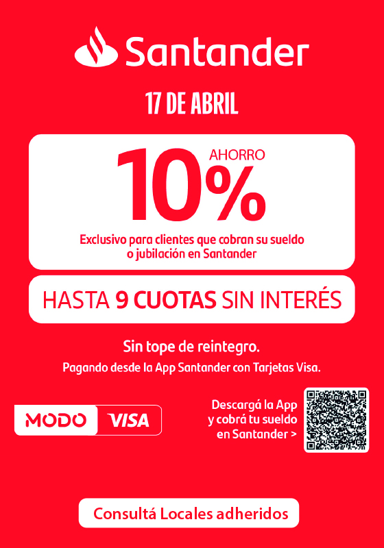 OTROS: CFTNA: COSTO FINANCIERO TOTAL EFECTIVO ANUAL. CFTNA: 0% (CARTERA DE CONSUMO) CFTNA: 2,14% (CARTERA COMERCIAL) TASA FIJA NOMINAL Y EFECTIVA ANUAL: 0%. Válida los días miércoles, del 25/03/2026 al 24/06/2026 (con excepción del 17/06/2026), en los locales adheridos, abonando con QR a través de la App Santander o App MODO con Tarjetas Santander Visa Crédito y/o Débito. Se excluyen compras abonadas por transferencias o pagos realizados con dinero en cuenta, a través de billeteras virtuales o financiadas por programas Cuota a Cuota. No acumulable con otras promociones. Válido únicamente para clientes titulares de cuenta bancaria Santander. En caso que la compra sea realizada con una tarjeta adicional, el reintegro se verá reflejado en la cuenta bancaria del titular. No acumulable con otras promociones. El ahorro es exclusivo para clientes suscriptos al programa Sorpresa Santander. La comisión por membresía mensual Sorpresa Santander será debitada de la cuenta o tarjeta de crédito del cliente, el quinto día hábil del mes, conocer precio vigente en: www.santander.com.ar/personas/beneficios/sorpresa. El ahorro se hará efectivo vía reintegro dentro de los 30 días de efectuado el consumo en la cuenta bancaria titular del cliente. Ejemplo: en una compra con tarjeta de crédito de $120.000, en 6 cuotas: registrará un reintegro de $12.000 en la cuenta bancaria titular, y del primer al sexto resumen de la tarjeta de crédito un consumo de $20.000 en cada uno. Los accionistas de Banco Santander Argentina S.A. no responden en exceso de su integración accionaria.