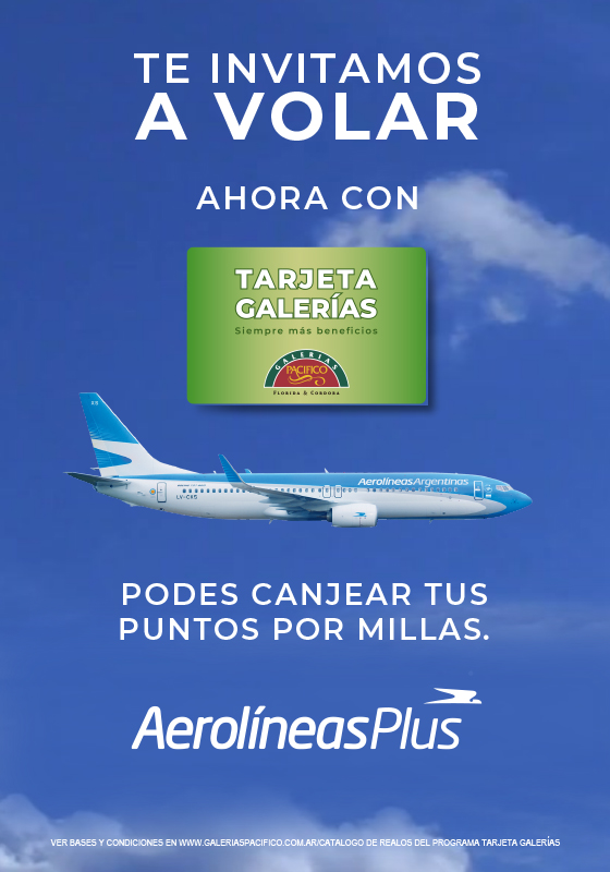 2.000.000 puntos del catalogo Tarjeta Galerias equivalen a 4000 millas de Aerolíneas Plus. Promoción vigente únicamente los dias Lunes y Martes de Enero 2026 desde el Lunes 12/01/2026 hasta el martes 27/01/2026. Se autoriza a canjear hasta un máximo de 2 (dos) premios 2x1 o sea un máximo de 8.000 millas por mes y por titular de la Tarjeta. Para hacer efectivo el canje el socio deberá presentarse en el Stand de Atención al cliente del centro comercial Galerías Pacifico, ubicado en el Nivel Fuente, sector Córdoba. En el horario de 10:00 a 21:00 hrs, donde el titular de Tarjeta Galerías deberá indicar el número de socio Aerolíneas Plus y DNI del titular de la cuenta a la cual acreditarle las millas. No combinable ni acumulable con otras promociones vigentes. En caso de un eventual reclamo de acreditación de Millas, el mismo deberá realizarse entre uno y tres meses, como máximo, de efectuado el canje enviando un correo a gpacifico@galeriaspacifico.com.ar indicando en el Asunto: “Solicitud Acreditación Millas” e informando su N° de documento del cliente de Tarjeta Galerías, Nº de socio Aerolíneas Plus, Nombre y Apellido, y adjuntando comprobante del canje. Las Millas serán acreditadas en la cuenta Aerolíneas Plus dentro de los 15 días hábiles. Los Socios acreditarán las Millas en una cuenta que será administrada por Aerolíneas Argentinas S.A., por los canjes realizados en Tarjeta Galerías. Dicha cuenta debe estar dada de alta previamente a la fecha de realizado el canje. En caso de que el Socio posea Millas próximas a vencer, la acreditación de las Millas provenientes del canje de Tarjeta Galerías no extenderá la vigencia del total, y si no hubiesen sido usadas a la fecha de vencimiento vencerán junto con el total de las Millas, sin poder retrotraerse como puntos al programa Tarjeta Galerías. La mecánica y/o ratio de canje podrán estar alcanzados por cambios que fije el Programa Tarjeta Galerías, no teniendo Aerolíneas Argentinas ninguna responsabilidad o relación con dichas modificaciones. Más información acerca del programa Aerolíneas Plus: https://www.aerolineas.com.ar/condiciones-de-uso. Más información acerca del programa Tarjeta Galerías: https://www.galeriaspacifico.com.ar/storage/points_listing/reglamento.pdf . GALERÍAS PACÍFICO S.A., San Martín 768 – CABA – CUIT 30-63675436-2. Aerolíneas Argentinas S.A. Av. Rafael Obligado s/n, Terminal 4, 5° Piso, Aeroparque Jorge Newbery - CABA - CUIT 30-64140555-4.