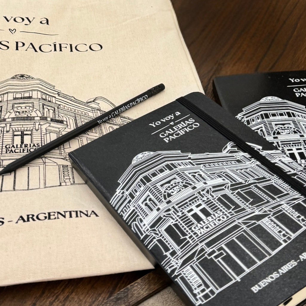 Una libreta de tapa dura mas un lápiz negro Galerias Pacifico.