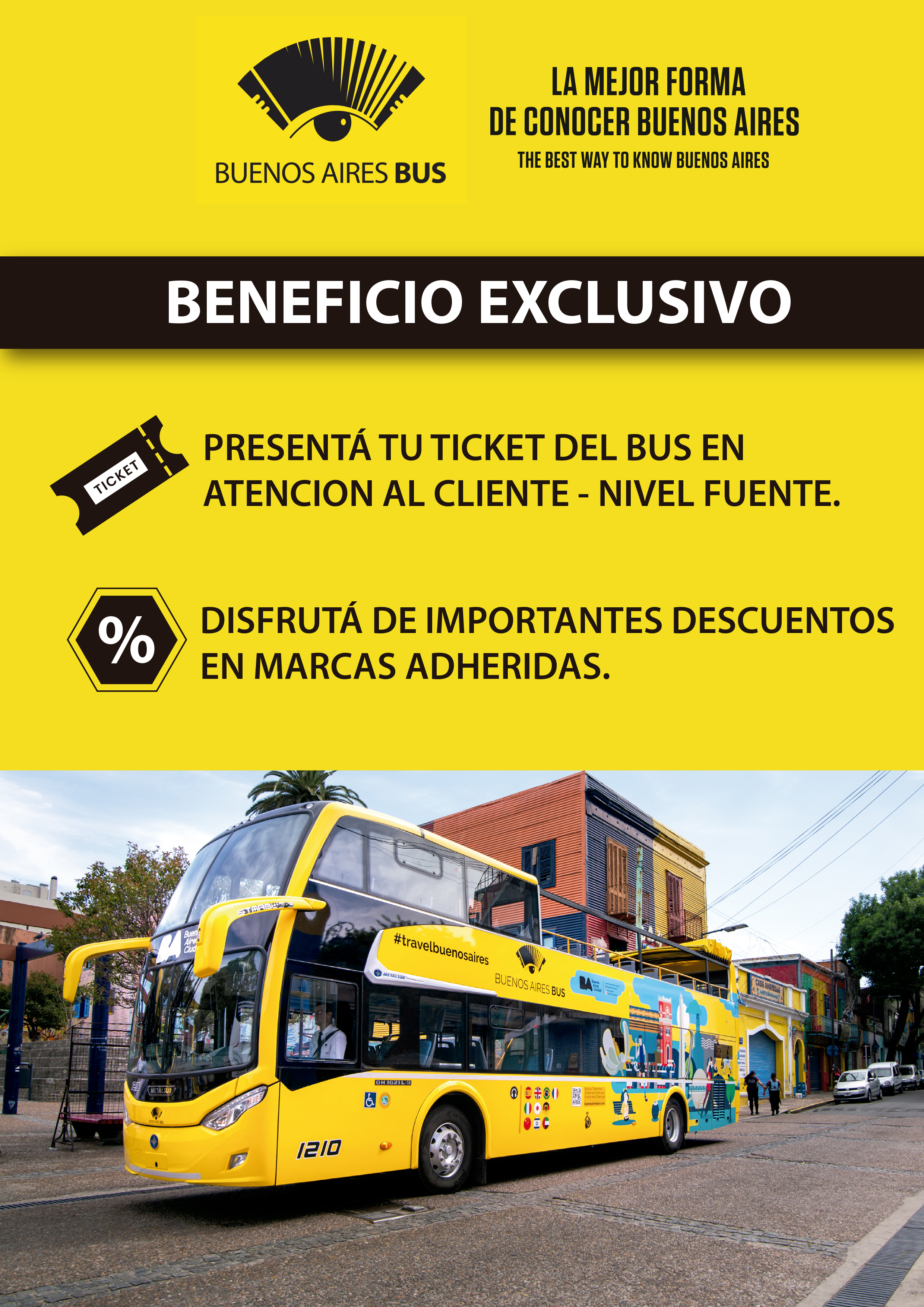PROMOCIÓN VALIDA DESDE EL 1º AGOSTO DE 2025 HASTA EL 31 ENERO DE 2026, EXCLUSIVO PARA CLIENTES QUE PRESENTEN EL TICKET DEL BUS TURISTICO. EL DESCUENTO NO ES ACUMULATIVO CON PROMOCIONES BANCARIAS, NI PROMOCIONES ESPECIFICAS DE LA MARCA O PRODUCTOS EN LIQUIDACIÓN. EL CLIENTE BUS TURISTICO DEBERÁ PRESENTAR SU TICKET EN EL STAND DE ATENCIÓN AL CLIENTE DONDE RECIBIRÁ LA TARJETA DE DESCUENTOS PARA ACCEDER A LOS BENEFICIOS VIGENTES PUBLICADOS EN LA SECCION DESCUENTOS.